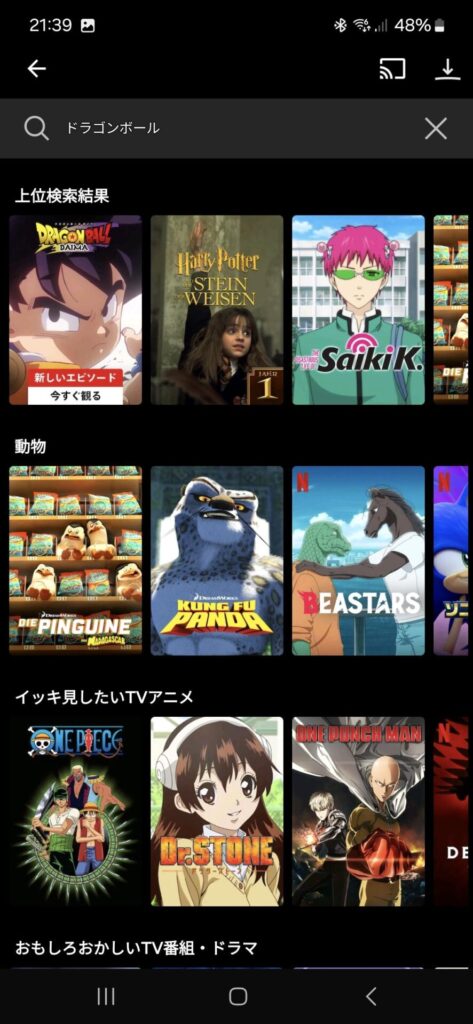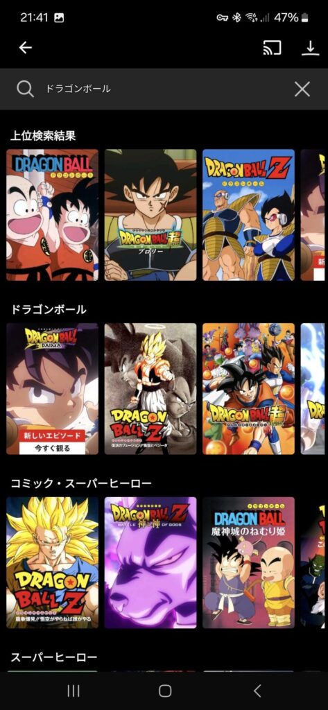 Netflixアプリを立ち上げ後、検索で『ドラゴンボール』と打ってみます。