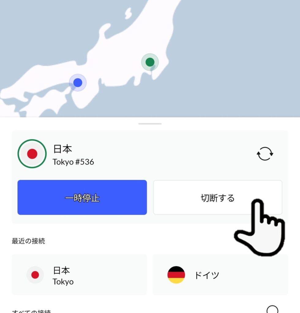 接続を切りたい時は、NordVPNのアプリを開いて、『切断する』を選択するだけ。