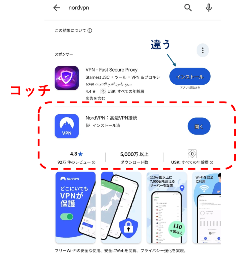 まずはNordVPNのアプリをインストールします。Androidユーザーの方はGoogle Playストアから、iPhoneユーザーの方はApple Storeから、”NordVPN”と検索します。
