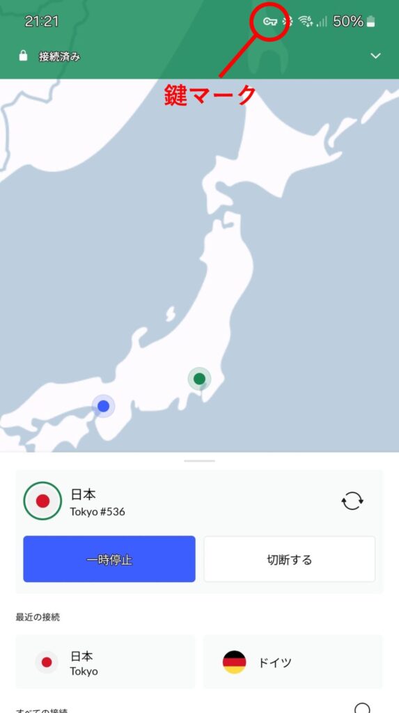 また、NordVPNのアプリを閉じても、上部アイコンに鍵マークが付いている時は日本サーバーに接続され、セキュリティが保たれている、という状態になります。