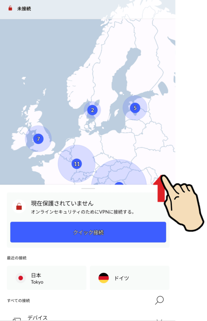 私は現在ドイツ在住ですので、NordVPNを使用していない場合は、ドイツにあるサーバーに自動的に繋がります。