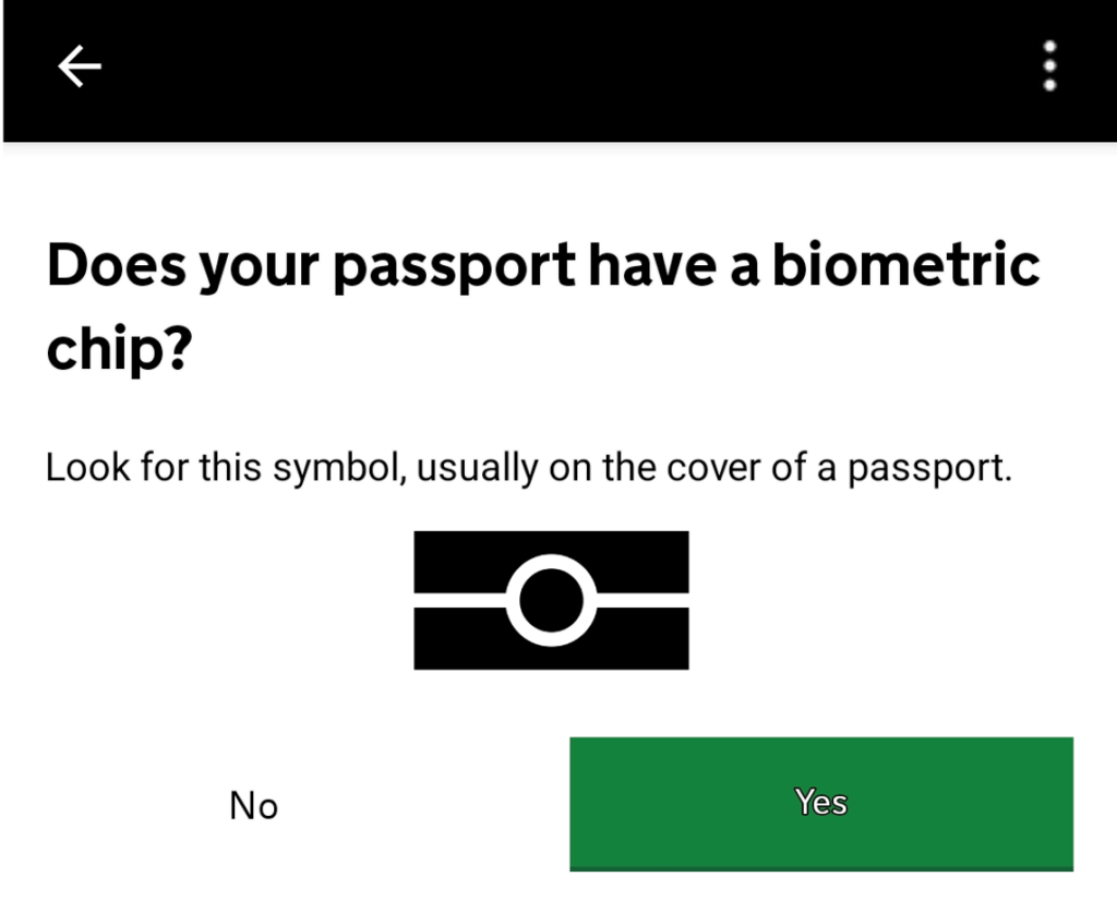 お持ちのパスポートに生体認証チップがあるかの確認があります。日本のパスポートには2006年3月以降に発行されたパスポートには生体認証チップが搭載されていますので、”Yes”を選択して次に進みます。