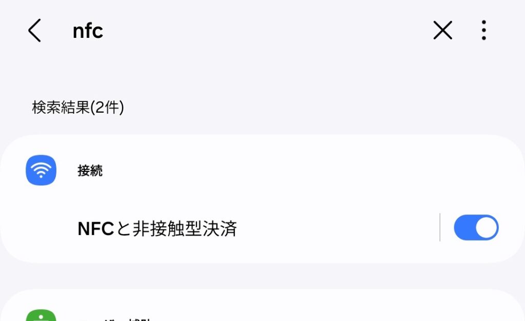 アンドロイドの場合は、設定から検索メニューで「NFC」と打つと、設定メニューが出ます。