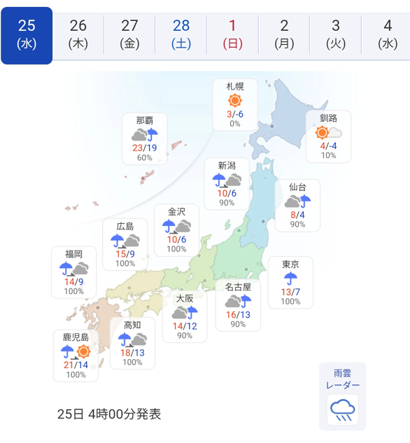 海外の天気は含まれていないので、海外在住者には関係ないか。ユーザーインターフェースは優れていて見やすいし、当たる確率も高め。
