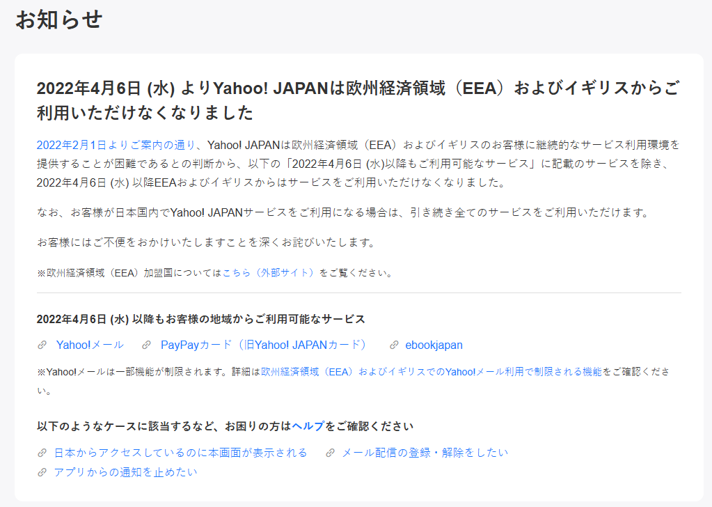 これは、欧州圏内で制定されている個人情報保護法の一つである、GDPR法(一般データ保護規則)に対応するコストに見合わないという判断により、Yahooサービスそのものを欧州圏内から撤退した、という理由によるものです。